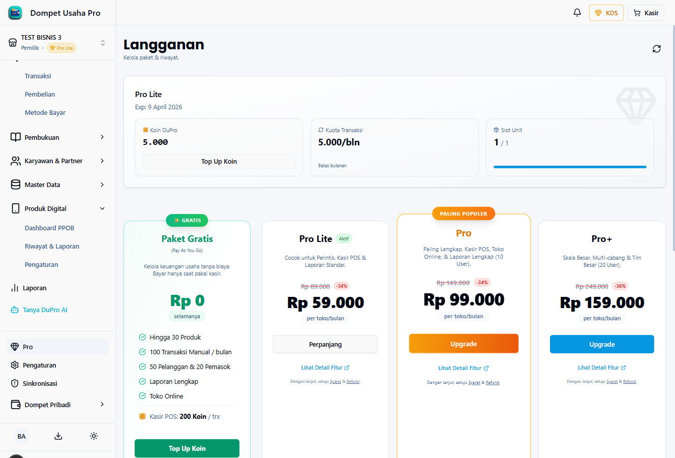 Bagian dari sistem langganan fleksibel (Pay-As-You-Go). Koin DuPro berfungsi sebagai biaya yang dihitung hanya berdasarkan transaksi kasir. Koin DuPro sepenuhnya merupakan utilitas aplikasi dan tidak dapat ditransfer atau dicairkan kembali.